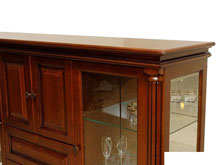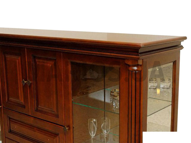 Комод состоит из двух шкафчиков с дверками из стекла, двух выдвижных ящиков и одного вместительного шкафчика с деревянными дверцами.