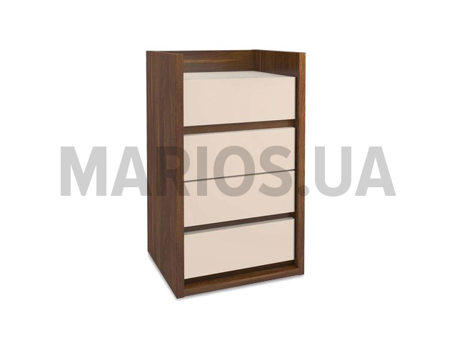 Комод состоит из четырех выдвижных ящиков. Направляющие в ящиках, делают закрытие легким и тихим. Ручек для открытия на ящиках нет, но открыть вы их сможете при помощи нажатия на него.