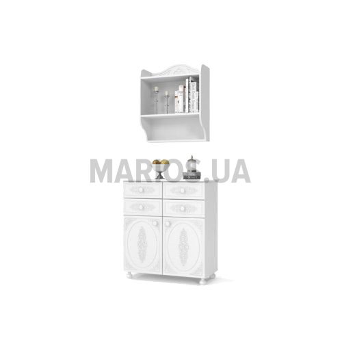 Характеристики мебели Материал ДСП, МДФ Комплект Ассоль-2 белый. Включает в себя: Полку АС-15; Комод АС-18. Размеры полки АС-15: ширина - 60 см; глубина - 26 см; высота - 75 см. Размеры комода АС-18: ширина - 80 см; глубина - 43 см; высота - 90 см. Ручки – фигурные. Материал фасадов: фирменная текстура 3D. Материал корпуса: ДСП ламинированное 18 мм. Цвет: белый.