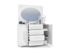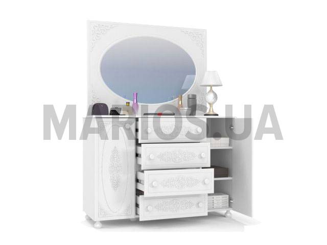 Характеристики мебели Материал ДСП, МДФ Комплект для спальни Ассоль-4. Включает в себя: Тумбу комбинированная АС-19; Зеркало АС-07. Размеры тумбы комбинированной АС-19: ширина - 120 см; длина - 50 см; высота - 82 см. Размеры зеркала АС-07; ширина - 80 см; глубина - 32 см; высота - 110 см. Ручки – фигурные. Материал фасадов: фирменная текстура 3D. Материал корпуса: ДСП ламинированное 18 мм. Цвет: белый.