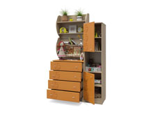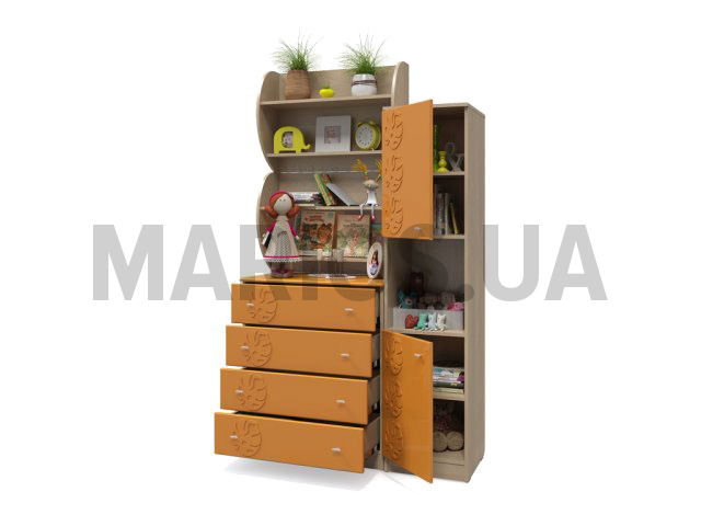 Характеристики мебели Материал ДСП, МДФ Комплект Маугли. Включает в себя: Навесную полку МДМ-9 (2шт). Комод МДМ-5. Пенал МДМ-13. Размеры навесной полки МДМ-9: ширина - 76 см; глубина - 25 см; высота - 55 см. Размеры комода МДМ-5: ширина - 76 см; глубина - 42 см; высота - 88,5 см. Размеры пенала МДМ-13: ширина - 40 см; длина - 42 см; высота - 170,5 см. Материалы: корпус - ДСП 16мм немецкого концерна Кроно Украина; фасады - глянцевая МДФ с фрезеровкой; торцы деталей оклеены ПВХ-кромкой фирмы MAAG. В ящиках применяются телескопические направляющие полного выдвижения. Используются газовые подъемники, в цоколях - подпятники. Цвета: клен/оранж.