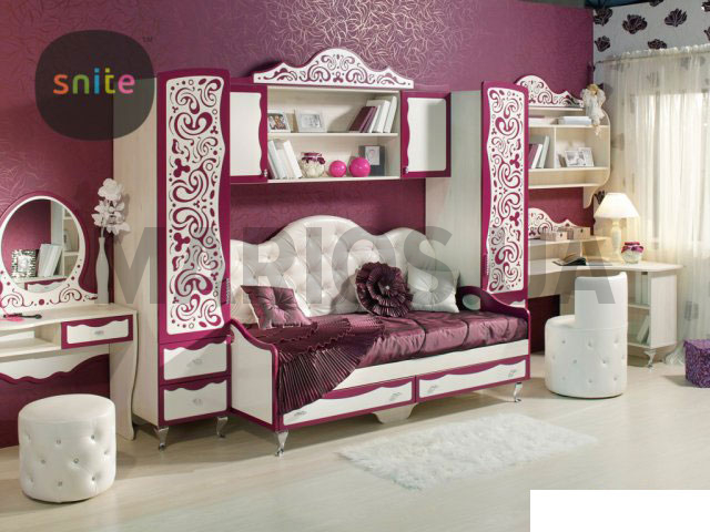 Характеристики мебели Материал ДПП, МДФ, ДСП Комплект мебели Ажур – оптимальное решение создание интерьера детской комнаты для юной девушки. Стильная и современная мебельная система, создаст атмосферу уюта и гармонии, а также создаст максимально комфортные условия для Вашего ребенка. Все предметы комплекта имеют необычные формы. Плавные изгибы, ажурные линии, сочетание двух цветов насыщенного фиолетового и перламутрово белого цвета придают изысканности, а неповторимый объемный узор кружева и применение страз "Сваровски" придают спальному гарнитуру изысканности и богатства. В комплект мебельного комплекта Ажур входят восемь предметов: роскошная диван-кровать (АР-203) с мягкой стеганной спинкой и спальным местом 90х190 см;белый угловой компьютерный стол (АР-104), который комплектуется оригинальной надстройкой (АР-106);вместительная навесная полка (АР-603) , которая имеет две открытых полочки и два закрытых шкафчика;открытая навесная полка (АР-605);непревзойденный туалетный столик (АР-101); левосторонний пенал (АР-409) и правосторонний (АР-408). Все предметы мебели изготовлены из качественных материалов - используется ДСП Kastamonu. По Вашему желанию можно выбрать любой цвет, представленный производителем Snite. Цвет МДФ фасада: перламутровый белый;фиолетовый. Цвета ДСП фасада: береза Майнау;кальвадос розовый;выбеленный дуб. Размеры дивана-кровать: Высота, см Ширина, см Глубина, см 120 195 106 Размеры стола: Высота, см Ширина, см Глубина, см 75 130 100 Размеры надстройки на стол: Высота, см Ширина, см Глубина, см 42,5 130 41,5 Размеры навесной полки АР-603: Высота, см Ширина, см Глубина, см 87 196 29 Размеры пенала: Высота, см Ширина, см Глубина, см 211,5 45 60 Размеры навесной полки АР-605: Высота, см Ширина, см Глубина, см 109,5 130 27 Размеры туалетного столика: Высота, см Ширина, см Глубина, см 142 86 41,5
