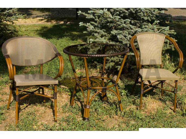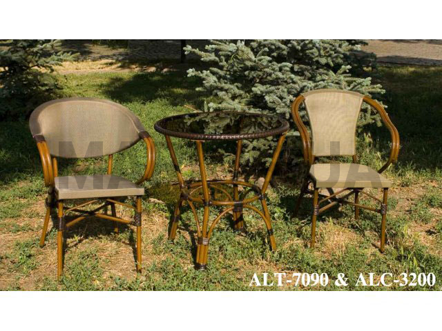 Характеристики мебели Материал алюминиевый сплав, тканевая обивка Цвет светло-серый Комплект мебели для дачного участка состоит из: стола модель ALT-7090;стул модель ALC-3300;стул модель ALC-3200. Стол изготовлен из алюминия с искуственным ротангом, столешница из стекла. Цвет: коричневый. Размеры: диаметр - 70 см, высота - 71 м. Стулья выполнены из алюминиевого сплава, сиденье - текстиль. Цвет: светло-серый. Размеры: глубина - 57 см, ширина - 55 см, высота - 82 см.