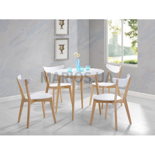 Характеристики мебели Материал массив гевеи, МДФ Комплект Нильсон состоит из стола и четырех стульев. Размеры стола: длина: 90 см; ширина: 90 см; высота: 75 см. Цвет: белый. Материал: массив гевеи, МДФ. Размеры стула. ширина: 48,5 см; высота: 51,5 см. Цвет: белый. Материал: массив гевеи, МДФ.
