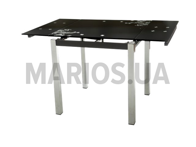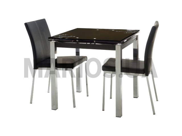 Характеристики мебели Материал кожзам, стекло, сталь Комплект стол T-236-2 + 2 стула N-10 Состоит из: Стол T-236-2 черный Размеры: Ширина - 74 см. Глубина - 74 см. Высота - 75 см. Максимальная ширина: 124 см. Материал столешницы: стекло. Материал основания: хромированная сталь. Вид: раскладные. Особенность: черный с серебрянными цветами. Стул N-10 черный белая строчка (2 шт) Размеры: Ширина: 38.5 см. Глубина: 43 см. Высота: 48 см. Максимальная высота: 87 см. Материал основания: сталь с напылением. Материал сидения: кожзам. Особенность: белая строчка, квадратная нога.