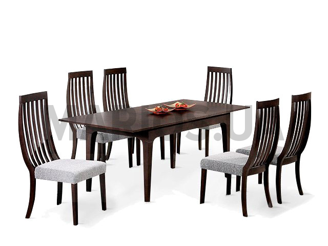 В комплект входит стол и 6 стульев. Материал: массив гевеи. Цвет: темный капучино. Размеры стола: