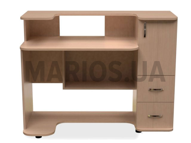120.00см x 55.00см x 95.00см Характеристики мебели Материал ДСП Компьютерный стол НСК-34 – удобная модель с надставкой над столешницей, обеспечивающая дополнительную рабочую поверхность. Стол отлично подойдет для стойки-ресепшн в офисе. Модель укомплектована тумбой с закрытыми полками и двумя выдвижными ящиками. В нижней части стола имеется дополнительная открытая полка. Материалом для изготовления данной модели служит ламинированная ДСП. На выбор предоставляется широкая палитра цветов. По желанию заказчика возможно изготовление модели в нестандартном цвете за дополнительную плату. Материал: корпус - ДСП 16мм; кромка торцов столешницы - ПВХ 2мм; кромка остальных торцов - ПВХ 0,5 мм.