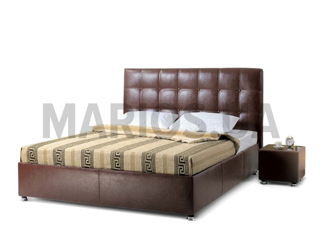Изголовье кровати мягкое и обшито качественным кожзаменителем, строчными швами поделено на множества квадратов. По бокам квадратов, в качестве украшения, используются декоративные пуговицы. Изножье у кровати отсутствует, что позволит Вам поставить ее в любую часть комнаты и подойти Вы сможете к ней с трех сторон.