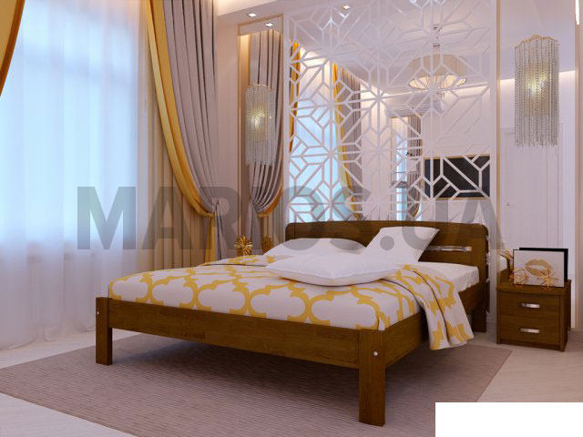 Кровать имеет изголовье из древесины, а отсутствие изножья позволяет подойти к кровати с трех сторон.