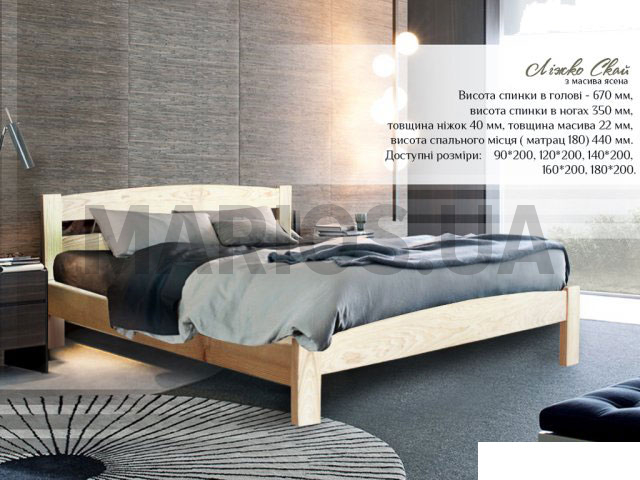 208.00см x 96.00см x 81.00см Вес0.00кг Характеристики мебели Материалмассив ясеня Кровать Скай - это односпальная модель со спальным местом 90х200. Кровать изготовлена из массива ясеня. Основание кровати состоит из ортопедических гнутых ламелей (расстояние между ними 4,5 см). Используются крепления maxi-luna. Они жёстко соединяют царги с изножьем и изголовьем, соответственно нет проблем с переносом или передвижением кровати. В комплекте к каждой кровати идет ключ под данный вид крепежа. <img alt="" src="https://img.mebelok.com/image/data/Meblikoff/maxi-luna.jpg" style="margin-left: 200px; margin-right: 200px;" /> Фурнитура и лак - двухкомпонентный не содержащий формальдегидов ( фирма - HERBERTS "HERLAC") производства Германия. Толщина царги: 2,2см; Толщина ножек: 4см; Высота изголовья: 81см; Высота изножья: 35см; Высота спального места: 44см (при высоте матраса 18см). Кровать можно укомплектовать подкроватным ящиком размером: в/ш/г - 15/98/75.