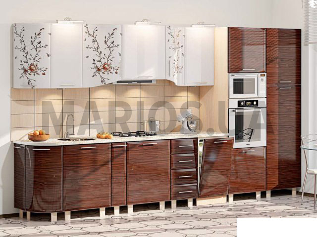 375.00см x 0.00см x 0.00см Характеристики кухонного гарнитура Материал корпуса МДФ, ПВХ Материал фасада МДФ, ПВХ Кухня-164Хай-тек 3,75 м выделяется из ряда прочих моделей своей дизайнерской изюминкой в виде декорированных росписью навесных шкафчиков.