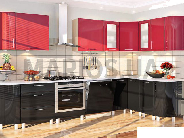 Гарнитур имеет современный внешний вид благодаря глянцевым поверхностям и интенсивной цветовой палитре. Напольные элементы окрашены в черный, а навесные имеют яркий алый оттенок.