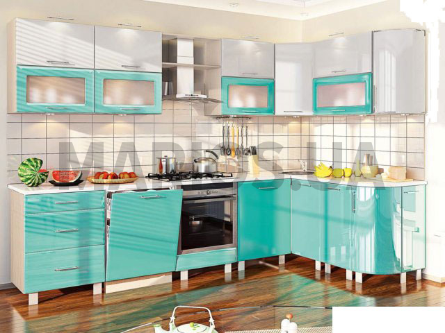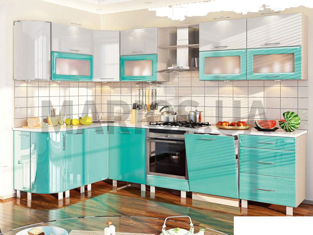 Дизайн и бирюзово-белая цветовая палитра кухни-188Хай-тек 3,0х1,7 м превратят Ваш интерьер в обитель природы и свежести.