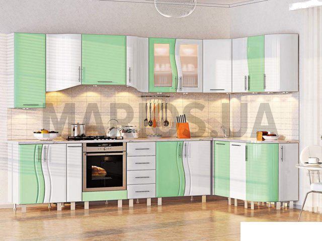 Она раскрашена в «освежающие» оттенки мятного и белого, которые способны преобразить интерьер, придав ему динамичности и современности. При этом, гарнитур включает множество вместительных шкафов, ящиков и карго.