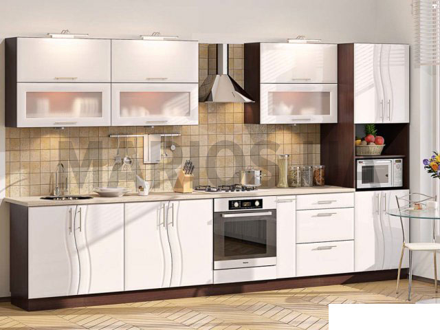 36 Характеристики кухонного гарнитура Материал корпуса МДФ, ПВХ Материал фасада МДФ, ПВХ Кухня-269 Волна 3,6 м создана исключительно в белом цвете. Подобная однотонность делает пространство значительно больше, а саму комнату – светлее.