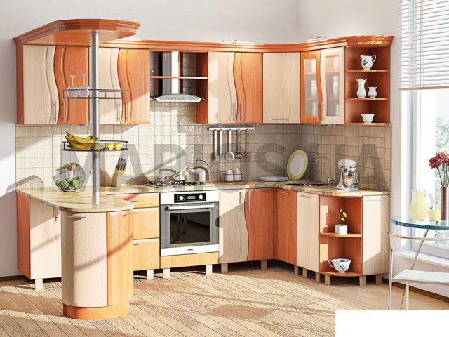 300.00см x 170.00см x 0.00см Характеристики кухонного гарнитура Материал корпуса МДФ, ПВХ Материал фасада МДФ, ПВХ Кухня-272 Волна 3,0х1,7 м, даже при своей угловой форме, имеет довольно большие размеры, поэтому подойдет для крупногабаритной комнаты.