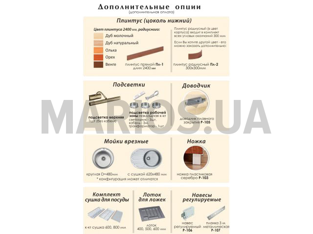 В стоимость кухни входит базовая комплектация и цена за столешницу, дополнительные опции оплачиваются отдельно.