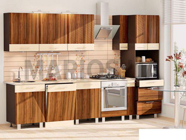 32 Характеристики кухонного гарнитура Материал корпуса ЛДСП Материал фасада ЛДСП Кухня-97 Софт Комби 3,2 м характеризуется традиционным дизайном в классическом стиле и уютными шоколадными оттенками. Имеет прямую форму, располагаясь вдоль стены.