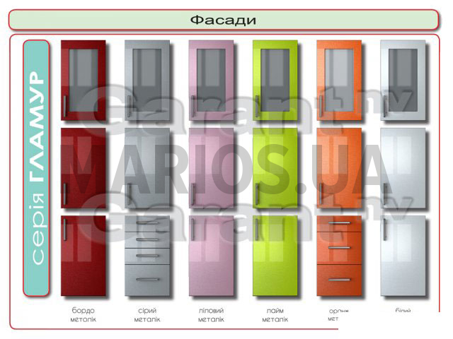 Материал фасада – МДФ толщиной 18 мм, ламинированный ПВХ пленкой. Такое покрытие надежно защищает поверхность гарнитура от любых повреждений, перепадов температуры и негативного воздействия влаги, а также существенно продлевает срок службы изделия.