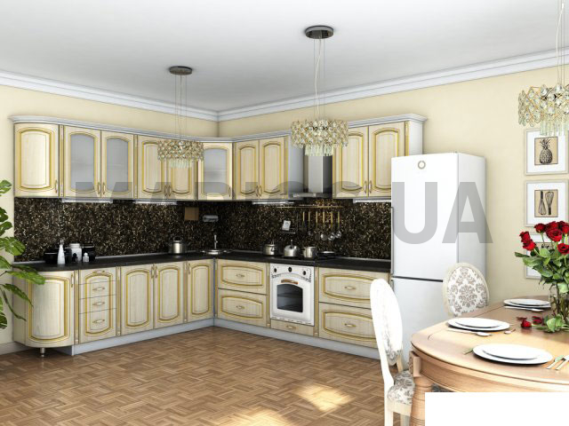 Элитный облик кухонному гарнитуру придают патинированные фасады, декорированные фрезеровкой в золотой отделке. Фасады выполнены из МДФ толщиной 18 мм, облицованного сверхпрочной ПВХ пленкой от ведущих европейских производителей. Такое покрытие защищает изделие от всех видов повреждений, негативного влияния влаги, пара и солнечных лучей, а также значительно продлевает срок службы.