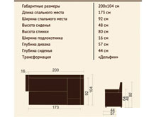 200.00см x 104.00см x 80.00см Характеристики дивана (кресла, тахты, углового дивана) Механизм трансформации дельфин Основа сидения Пенополиуретан Бельевой ящик есть
