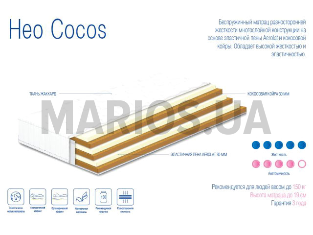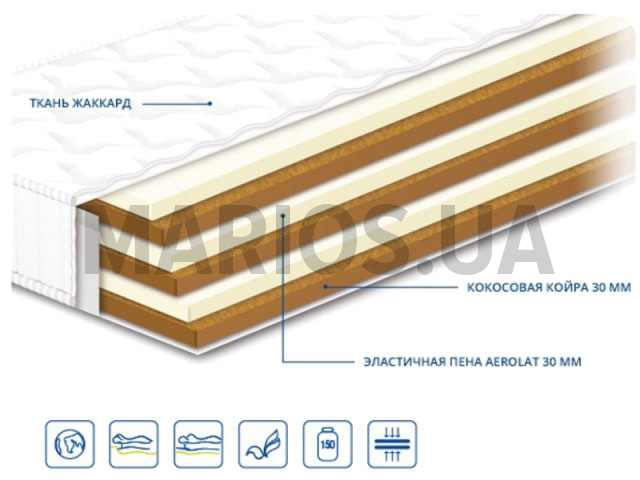 190.00см x 140.00см x 19.00см Матрасы Допустимая нагрузкадо 150 кг Пружинный блокнет Составэластичная пена Aerolat 3 см; кокосовая койра 3 см Эффект зима-летонет Матрас ортопедический Нeo Cocos 140х190Состав:- ткань жаккард- эластичная пена Aerolat 3 см- кокосовая койра 3 см- эластичная пена Aerolat 3 см- кокосовая койра 3 см- эластичная пена Aerolat 3 см- кокосовая койра 3 см- ткань жаккардЖесткость: жесткийВысота: до 19 смМаксимальная нагрузка: до 150 кг на одно спальное местоГарантия: 3 года