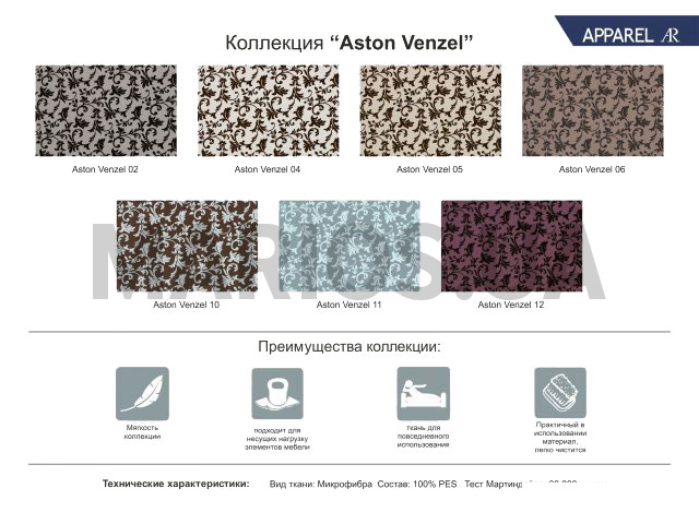 100.00см x 145.00см x 0.00см Вес0.00кг Характеристики тканей Износостойкость30000Категория ткани4-я категорияПлотность г/м.квПроизводительКитайСостав100 % полиэстерТип тканифлок Микрофибра Aston Venzel 10 ткань, на которую белым цветом выполнено напыление растительного рисунка на поле темно коричневого цвета. Оригинальная ткань в сочетании с однотонной тканью из этой же коллекции станет настоящей находкой для мебельщиков. Природние цвета создадут в Вашем доме интерьер способствующий отличному отдыху после трудового для. В эксплуатации такая ткань очень удобная и будет служить Вам долго и надежно.Состав материала:<span style="font-family: Tahoma; font-size: 13px; text-align: justify; 100 % <span style="font-family: Tahoma; font-size: 13px; text-align: justify; ПЭС.