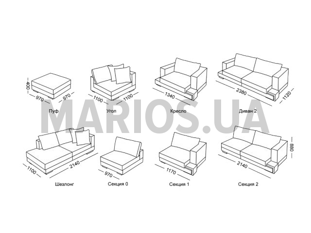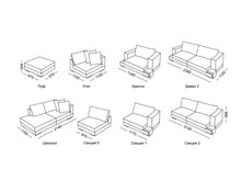 Характеристики дивана (кресла, тахты, углового дивана) Механизм трансформациинет Основа сиденияпоролон, собранный в "сендвич", поролон повышенной комфортности HR3018, HR3535, HS2012 Размер спального местанет Бельевой ящикнет Модульный диван Palermo-1 В комплпект входит: Секция 2 - 214х112х88 см Угол - 110х110х88 см Пуф - 97х97х40 см Ножки дивана и декоративные элементы изготовлены из натурального дерева. Материалы: Каркас - брус натурального дерева хвойных пород, фанера, ДСП, ДВП Наполнитель - поролон различной степени плотности, собранный в "сендвич". поролон повышенной комфортности HR3018, HR3535, HS2012 Экологичный клей производства Германия Фурнитура европейских производителей Обивочные ткани
