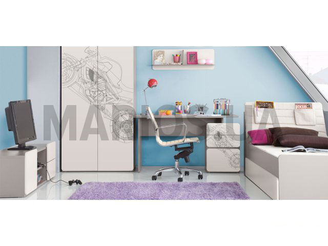 Характеристики мебели Материал ламинированное ДСП Каждый подросток нуждается в своей комнате, где он сможет остаться наедине, расслабиться, собраться или заняться любимым делом: чтением книг, просмотром фильмов или просто отдохнуть. В комнате подростка должно быть продуманно и учтено: рабочее место, комфортная кровать или диван, место для хранения вещей. Молодежный комплект 2pir включает в себя элементы мебели, которые создадут современный и стильный интерьер в комнате. В молодежный комплект входит: диван-кровать. Спальное место 90х200. Диван имеет вместительный ящик для хранения белья или вещей;шкаф двухдверный. Имеет просую форму и строгий вид. Добавить изысканности и создать неповторимый интерьер в комнате, можно с помощью рисунка, который наносится на дерки шкафчика. Шкаф имеет одну полку и штангу. Можно заказать комплект полок;письменный стол с выдвижными ящиками. За таким столом будет приятно провести время, даже если и за работой. На шкафчики стола можно нанести рисунок, такой же, как и на шкафу;тумба TV 140 имеет высокий шкафчик, две открытых полки и два выдвижных ящика;навесная полка, можно повесить ее над рабочим местом и сложить учебники или другие аксессуары. Весь комплект не имеет ручек для открытия, все дверки, ящики и шкафчики оснащены системой push-up. Мебель изготовлена из ламинированной плиты многослойной структуры - прочного и износоустойчивого материала, поэтому прослужит Вам ни один десяток лет. Размеры дивана-кровати: Высота, см Ширина, см Длина, см 97 205 95 Размеры шкафа двудверного: Высота, см Ширина, см Глубина, см 216,5 96,5 58 Размеры письменного стола: Высота, см Ширина, см Глубина, см 75 140 65 Размеры тумбы TV: Высота, см Ширина, см Глубина, см 44,5 137 45 Размеры навесной полки: Высота, см Ширина, см Глубина, см 30 90 20