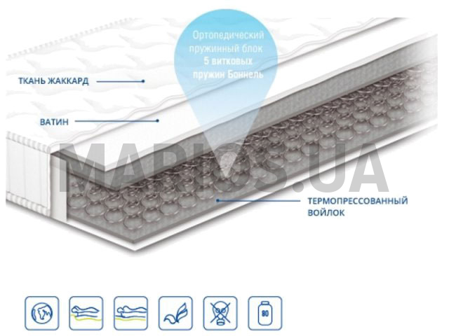 - термопрессованный войлок Эффект зима-лето нет Ортопедический матрас Чемпион 1 120х200 Состав: - ткань жаккард - иглопробивной ватин - термопрессованный войлок - пружинный блок Боннель - термопрессованный войлок Жесткость: средняя Высота: 16 см Максимальная нагрузка: до 80 кг Гарантия: 20 лет на пружинный блок и 3 года на ткани и наполнения.