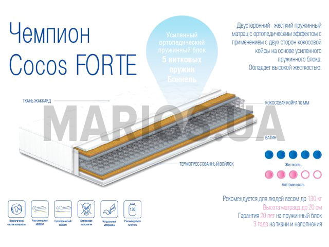 Термопресованный войлок. Эффект зима-летонет Ортопедический матрас Чемпион Cocos Forte 140х200Состав:Обивка жаккардСинтепонВатинКокосовое волокно 10 мм.Термопресованный войлокПружинный блок "Боннель"Термопресованный войлокЖесткость: выше среднейВысота: 20 смМаксимальная нагрузка: до 130 кгГарантия: 20 лет на пружинный блок и 3 года на ткани и наполнения.