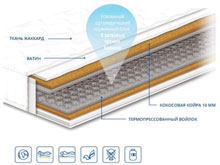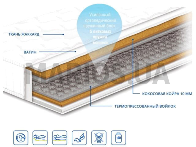 Термопресованный войлок. Эффект зима-лето нет Ортопедический матрас Чемпион Cocos Forte 70х190 Состав: Обивка жаккард Синтепон Ватин Кокосовое волокно 10 мм. Термопресованный войлок Пружинный блок "Боннель" Термопресованный войлок Жесткость: выше средней Высота: 20 см Максимальная нагрузка: до 130 кг Гарантия: 20 лет на пружинный блок и 3 года на ткани и наполнения.