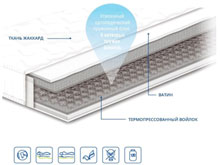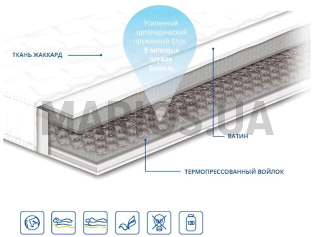 Эффект зима-лето нет Ортопедический матрас Чемпион Forte 140х190 Состав: - ткань жаккард - иглопробивной ватин - термопрессованный войлок - пружинный блок Боннель - термопрессованный войлок - иглопробивной ватин - ткань жаккард Жесткость: средняя Высота: 18 см Максимальная нагрузка: до 120 кг Гарантия: 20 лет на пружинный блок и 3 года на ткани и наполнения.