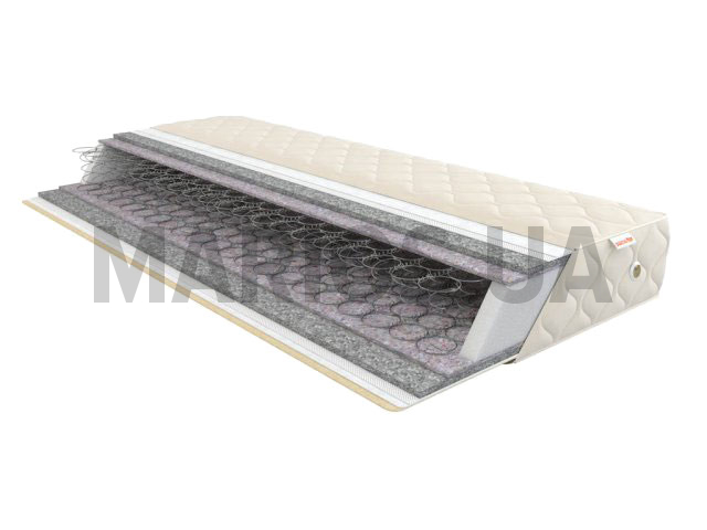 Модель имеет рамный, зависимый пружинный блок "Bonnel". В качестве промежуточного слоя применяется термоскрепленное волокно, достаточно упругое и жесткое, которое защищает от механического повреждения. Плюс к этому в составе матраса имеется мягкий войлок, что делает спальное место еще более удобным, и силиконизированное волокно, которое обладает превосходными теплосберегающими свойствами.