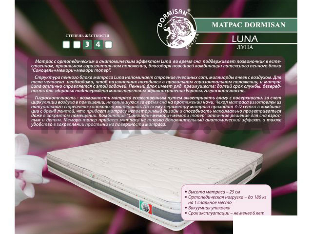 Данная модель разработана по новейшим технологиям из экологически чистых материалов. Матрас Luna сделает Ваше спальное место максимально комфортным, здоровый и крепкий сон Вам обеспечен.