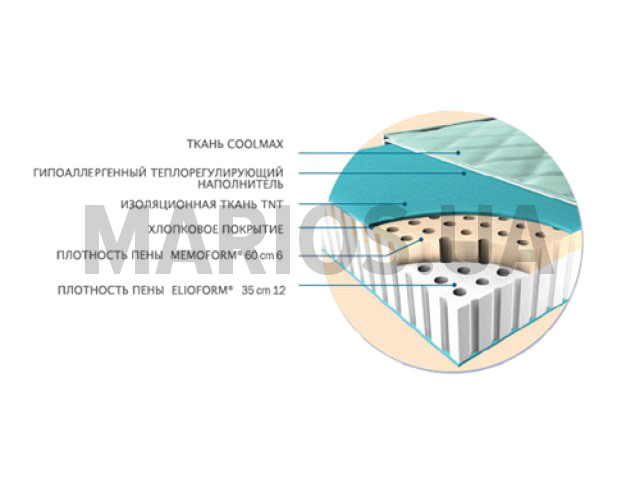 Еще одним из основных наполнителей матраса Duoform является воздухопроницакмый материал с пористой структурой ELIOFORM 12 см, который изготовлен из вулканизированного полиуретана с добавлением натурального латекса и двух видов полиэстера. Материал ELIOFORM обладает высокой стойкостью к деформации, мягкий, эластичный, обеспечивающий оптимальную поддержку позвоночнику человека.