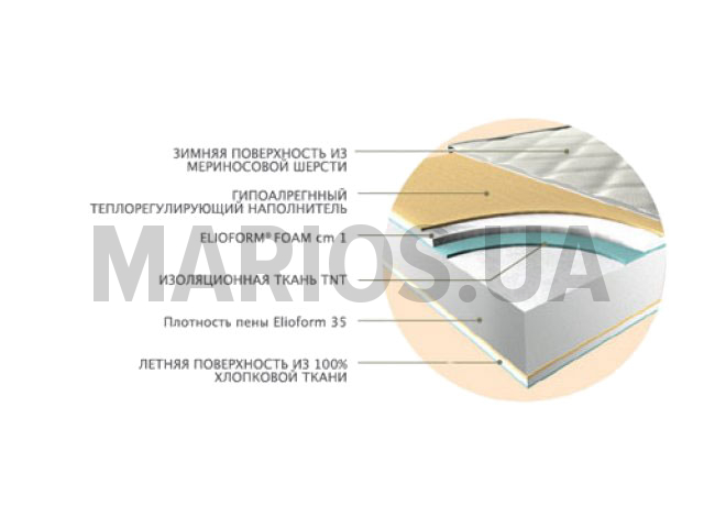 Чехол зимней стороны изготовлен из натуральной мериносовой шерсти. Это покрытие из мериносовой шерсти обладает большим количеством лечебных свойств: оно способствует уменьшению боли, особенно при ревматизме и радикулите; обеспечивает нормальный теплообмен тела, регулирует влажность, долговечна. Шерсть сохраняет температуру тела человека, что способствует комфортному сну в зимний период времени.
