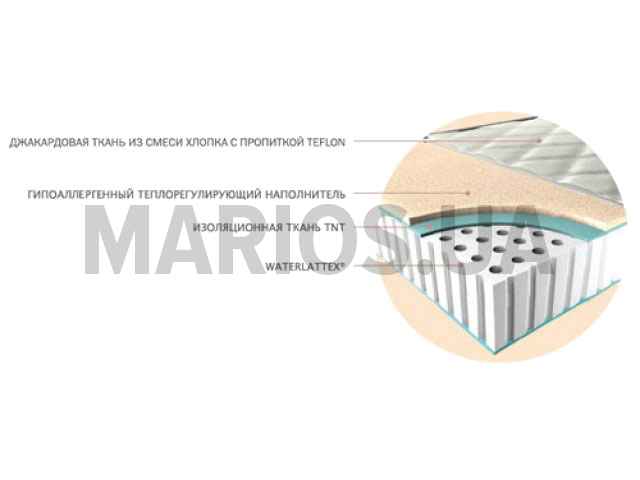 190.00см x 160.00см x 18.00см Матрасы Допустимая нагрузка180кг Пружинный блокнет Состав1) жаккардовый чехол из смеси хлопка с пропиткой TEFLON; 2) гипоаллергенный теплорегулирующий наполнитель; 3) изоляционная ткань TNT; 4) WATERLATEX; 5) мериносовая шерсть. Эффект зима-летоесть