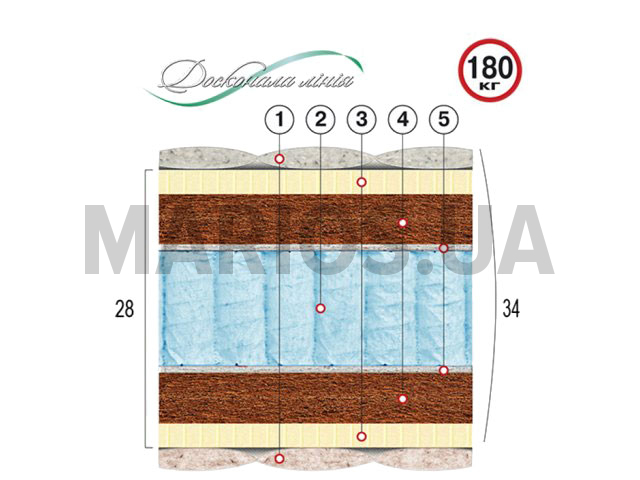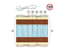Состав: <u>трикотажный стеганый чехол</u> с застежкой "Молния" с трех сторон, на объемном наполнителе, с примесью волокон шерсти и хлопка, что обеспечивает эффект "зима-лето", ткань бортовой ленты - жаккард; <u>усиленный пружинный блок "Pocket Spring"</u> - это блок независимых пружин, каждая из которых зашита в свой чехол, благодаря чему усиливается ортопедический эффект матраса; <u>жесткий настил «Thermofelt» - </u>настилочный материал, который распределяет нагрузку и обеспечивает защиту мягких настилв от металлической структуры пружинного блока; <u>настил латекс - </u>чрезвычайно эластичный и упругий, хорошо вентилируемый и гигиеничный материал. Долговечен, не гигроскопичен, не вызывает аллергии; <u>настил кокосовая койра -</u> плиты из волокон кокосового ореха, скрепленных напылением латексных растворов. Обладает бактерицидными свойствами, не поддается гниению, не аллергичен. <u>волокна хлопка</u> - обеспечивает естественный баланс влаги, способствует гигиене и оптимальному микроклимату среды; <u>волокна шерсти -</u>значительно улучшает качество матрасов, за счет свойств создавать оптимальный микроклимат и сохранять тепло; <u>рамочная пружинная основа</u> -повышает уровень долговечности матраса, гарантирует высокий уровень качества матрасов.