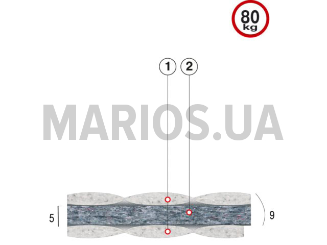 3) материал нетканный «Sprut». Эффект зима-лето нет Ортопедический матрас Велам Бриз-лайт нестандартный размер (м2) Состав: 1)<u>жаккардовый стеганный чехол на объемном наполнителе с волокнами хлопка. Состав жаккардовой ткани: 60% полипропилен и 40% полиэстер;2) нетканный материал Thermoflex - это упругая объемная структура из уплотненных горизонтальных слоев волокон;<u>3) материал нетканный «Sprut» с добавками волокон кокоса. Отличается способностью увеличивать эффект упругости и долговечности поверхности матраса; Технические характеристики: допустимая нагрузка на одно спальное место до 80 кг;регламентированная высота матраса: 5 см;габаритная высота матраса: 9 см;вес матраса: 4,74 кг. Потребительские свойства: матрас обладает ортопедическими свойствами;хорошая циркуляция воздуха (технология MaxAir);гипоаллергенность;натуральные компоненты;профилактика позвоночника;гигиеническая безопасность.