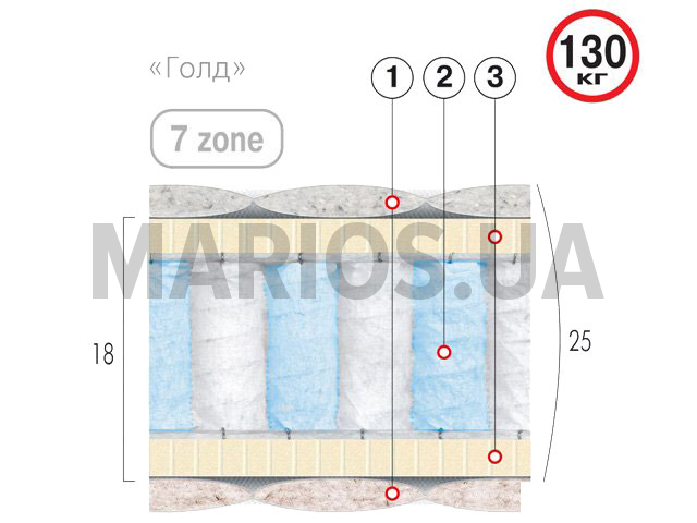 200.00см x 180.00см x 18.00см Вес 53.50кг Матрасы Допустимая нагрузка130кг Пружинный блокPocket Spring Состав1) стеганый чехол на объемном наполнителе "Sprut" с примесью волокон шерсти; 2) настил латекс; 3) Pocket Spring; 4) настил латекс; 5) стеганый чехол на объемном наполнителе "Sprut" с примесью волокон хлопка. Эффект зима-летоесть Матрас Голд 180х200 - это ортопедическая модель, отличного качества, из серии "премиум" производителя Велам. Она создана для двуспальной кровати такого же размера. Матрас изготовлен из натуральных экологически чистых материалов, поэтому Ваше здоровье в полной безопасности.Покупая это изделие, Вы не только обеспечиваете себя комфортным отдыхом, но и превосходным, всегда летящим настроением. Состав: <u>стеганый чехол на объемном наполнителе "Sprut"</u>, с примесью волокон шерсти и хлопка, что обеспечивает эффект "зима-лето", основная ткань - трикотаж, ткань бортовой ленты - жаккард; <u>Pocket Spring</u> - это семизонный блок независимых пружин (1,8 в диаметре) различной упругости, где максимальный диметр витка 64мм, высота пружин 150мм (плотность от 250 шт/м<sup>2</sup>); <u>настил латекс</u> - материал, имеющий в своем составе сок гевеи, обладающий высокой эластичностью и эргономичностью, плюс износостойкость, гипоаллергенность и гигиеничность. Технические характеристики: допустимая нагрузка на одно спальное место до 130 кг; регламентировнная высота матраса: 18 см; габаритная высота матраса: 25 см; вес матраса: 53,5 кг. Потребительские свойства: эффект "зима-лето"; матрас обладает ортопедическими свойствами; природная циркуляция воздуха - технология "MaxAir"; подтвержденная гигиеническая безопасность; профилактика позвоночника; натуральные компоненты; рамочная пружинная основа; съемный чехол.