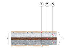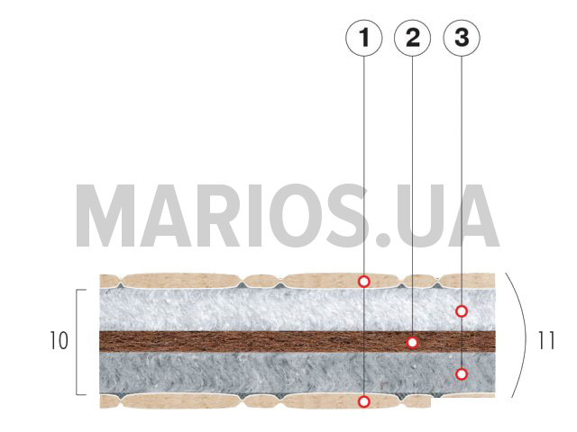 кокосовая койра. Эффект зима-лето есть Ортопедический матрас Велам Коко-фаворит нестандартный размер (м2) - детская беспружинная модель. Основа матраса - настил из кокосовой койры. Состав: стеганный чехол из х/б ткани с наполнителем Sprut (1);латексированная кокосовая койра (2);нетканый настил Sprut с волокнами хлопка и шерсти (3). Технические характеристики: регламентированная высота матраса - 10 см;габаритная высота - 11 см;вес - 8 кг/м.кв. Потребительские свойства: ортопедический эффект;настил из материала Sprut обладает отличной воздухопроницаемостью;наполнение волокнами хлопка и шерсти обеспечивает эффект "зима-лето";антибактериальная защита;гипоаллергенный;экологически чистые наполнители.