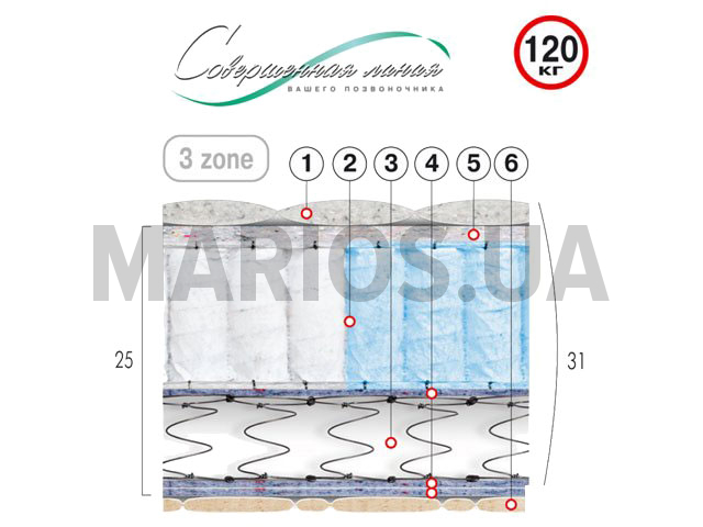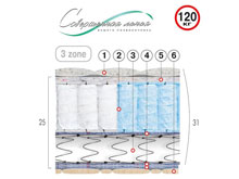 Thermofelt. Ортопедический матрас Велам Оникс нестандартный размер (м2) Состав: чехол - стеганный жаккард с хлопковым наполнителем (1); нетканый материал Thermoflex (5); 3-зонный независимый пружинный блок Pocket Spring (2); жесткий настил Thermofelt (4); пружинный блок Боннель (3); жаккард хлопковый.? Технические характеристики:Высота (габаритная/регламентированная): 31/ 25 см.Нагрузка: до 120 кг.Уровень жесткости: средний.