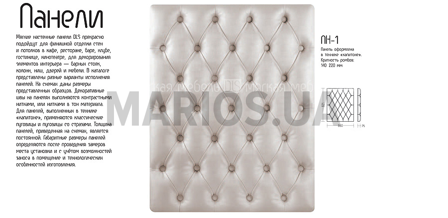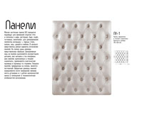 Описание: панель оформлена в технике "капитоне". Кратность: 140х220 мм. Рекомендуемые обивочные материалы: кожзамы мягкие, эластичные. Кожи тонкие. Запрет на применение: кожи ПУ, крокко, буттеро, бикла. Ткани "рогожка", с раппортом (узором), в полоску. Примечание: рекомендуется в каждом конкретном заказе по применяемым материалам консультироваться с конструктором.