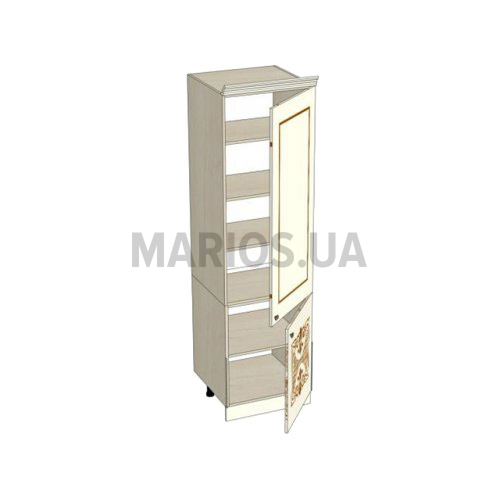 Пенал укомплектован пятью прочными полками и двумя дверцами - верхней и нижней, имеющими право- и левостороннюю сборку. Пенал Ассоль предназначен для хранения крупногабаритной посуды, кухонной техники, консервации, а также запасов продуктов, не требующих специального температурного режима.