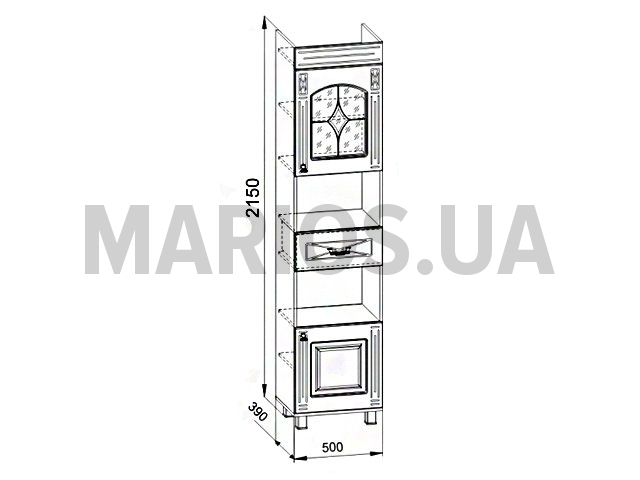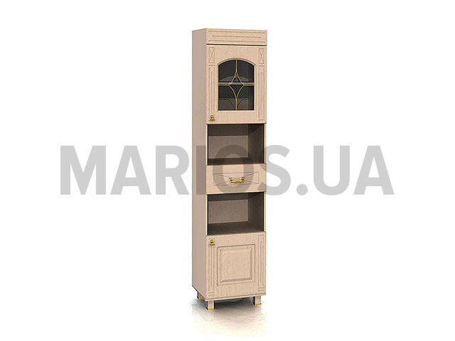 Материал - высококачественная ДСП 16мм немецкого концерна "Кроно Украина". Материал фасадов - МДФ с фрезеровкой. Дверца верхнего отделения имеет стеклянные вставки, которые украшены витражными элементами золотисто-бронзового цвета. Ручки - цвета "бронза". Доступны два варианта цветового исполнения: "орех" и "клен". Цвет ножек полностью совпадает с цветом всего изделия. Размеры пенала ЭМ-3 Элизабет