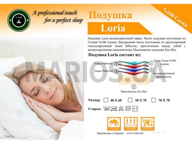 70.00см x 50.00см x 0.00см Вес0.00кгХарактеристики наматрасника / подматрасника / топпера Материал, состав100% хлопок, наполнитель eco flexОсновной цветбелый Подушка Loria 50х70</strong> – натуральная и антиллергенная, выполнена из качественного сатина % 100 хлопок. Особенност подушки состоит в том что модель имеет внутренний чехол который изготовлен из двухсторонней гипоаллергенной ткани "fullcover ". Подушка простегана и имеет антиаллергенный наполнитель Eco-Flex . Стежка придает форму подушке и долговечность в эксплуатации. Сама же подушка мягкая и упругая, и благодаря таким свойствам нагрузку во время сна распределяется равномерно, принимая удобную форму. <br />