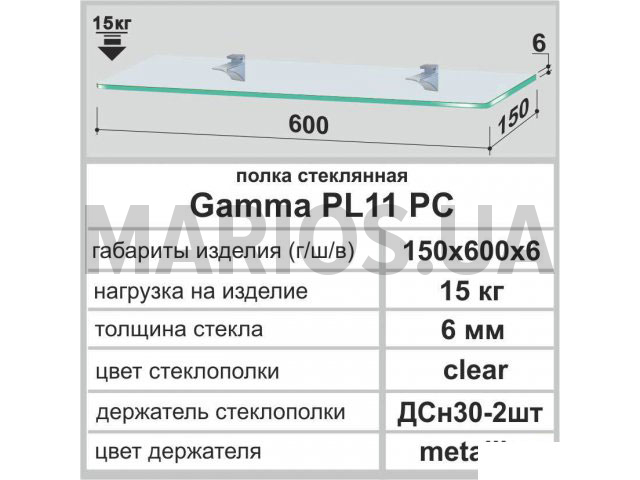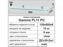 150.00мм x 600.00мм x 6.00мм Характеристики мебели МатериалСтекло Прямоугольная стеклянная полка Gamma PL 11 PC 150х600х6 с прозрачным стеклом.