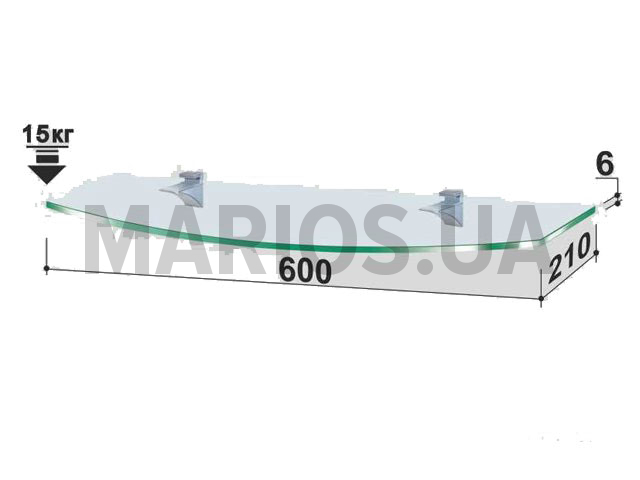 210.00мм x 600.00мм x 6.00мм Характеристики мебели МатериалСтекло Радиусная стеклянная полка Gamma PL7 RC 210х600х6 с прозрачным стеклом.Изготовлена из стекла толщиной 6 мм.Нагрузка на изделие 15 кг.Полка укомплектована держателем стекла ДСн30 - 2 шт.Цвет держателя - metallik.Габариты изделия (Г/Ш/В) - 210/600/6.