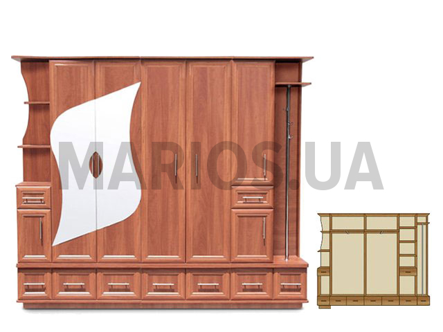 40.00см x 265.00см x 224.00см Характеристики мебели Материал ДСП Прихожая Мишель – модель, воплотившая высокий уровень функциональности с невероятной эстетикой дизайна. Если размер Вашего помещения позволяет разместить мебельную стенку длиной свыше двух с половиной метров, то данная модель - вне конкуренции. Она обеспечит идеальное место для хранения всех Ваших вещей, являясь стильным украшением интерьера. Изделие включает два двухдверных шкафа для одежды на плечиках, множество полок и выдвижных ящиков, отсек с вертикальной штангой и крючками, а также открытые скругленные полочки для декоративных украшений. По Вашему желанию прихожая может быть изготовлена в любом цвете из предложенной палитры. На нестандартный цвет из палитры Swisspan действует надбавка. В данной модели используется серийная фурнитура. Материал: ЛДСП